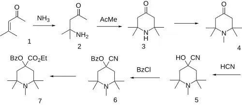 The Aldol condensation between two equivalents of acetone gives Mesityl oxide [141-79-7] (1) (isophorone is a side-product of this reaction). Ammonolysis of mesityl oxide formed diacetonamine [625-04-7] (2). The reaction of this product with acetone then gives 2,2,6,6-tetramethyl-4-piperidone [826-36-8] (3) {aka triacetonamine}. N-methylation of the secondary amine gives 1,2,2,6,6-pentamethylpiperidin-4-one [5554-54-1] (4). Cyanohydrin formation gives CID:434556 (5). Esterification of the tertiary alcohol with benzoyl chloride gives (6). Pinner reaction of the nitrile with EtOH/H+ affords alpha-eucaine (7).