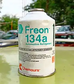 1,1,1,2-Tetrafluoroethane (also known as norflurane (INN), R-134a, Klea 134a, Freon 134a, Forane 134a, Genetron 134a, Green Gas, Florasol 134a, Suva 134a, HFA-134a, or HFC-134a) is a hydrofluorocarbon (HFC) and haloalkane refrigerant with thermodynamic properties similar to R-12 (dichlorodifluoromethane) but with insignificant ozone depletion potential and a lower 100-year global warming potential (1,430, compared to R-12's GWP of 10,900).[1] It has the formula CF3CH2F and a boiling point of −26.3 °C (−15.34 °F) at atmospheric pressure. R-134a cylinders are colored light blue.[2] A phaseout and transition to HFO-1234yf and other refrigerants, with GWPs similar to CO2, began in 2012 within the automotive market.[3]