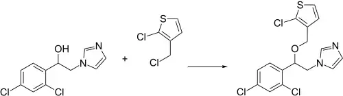 A displacement reaction between 1-(2,4-dichlorophenyl)-2-(1H-imidazol-1-yl)ethanol and 2-chloro-3-(chloromethyl)thiophene is performed.