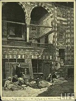 In late June 1883, the first cases of cholera in Egypt, recently occupied by the British Empire in 1882, occurred in the port city of Damietta on the Mediterranean coast and rapidly spread in the Nile Delta and throughout the country in the summer and autumn,[26] "notwithstanding cordons maintained with a degree of severity and cruelty almost unexampled".[27] In the course of a few months, according to different estimates between 50,000 and 60,000 people died.[1][10][26] The sources of the contamination most likely were Muslim pilgrims returning from Mecca and Indian troops serving in the British army.[1][10] French and German bacteriologists were sent to Alexandria in 1883 to study the disease and determine its cause.[28] (See: Scientific advances)