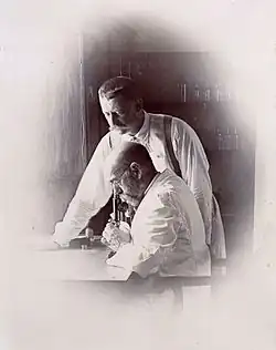 ![]() German microbiologist Robert Koch (on the microscope) and Richard Friedrich Johannes Pfeiffer (standing) investigating cholera outbreak in Bombay, India. | |