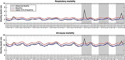 - ↑ Simonsen, Lone; Viboud, Cecile (2021-08-12). "A comprehensive look at the COVID-19 pandemic death toll". eLife. 10: e71974. doi:10.7554/eLife.71974. ISSN 2050-084X. PMC 8360646. PMID 34382937. Archived from the original on 2022-12-30. Retrieved 2022-10-04.