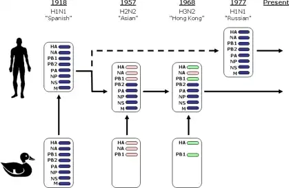 - ↑ Nelson, M. I.; Viboud, C.; Simonsen, L.; Bennett, R. T.; Griesemer, S. B.; St. George, K.; Taylor, J.; Spiro, D. J.; Sengamalay, N. A.; Ghedin, Elodie; Taubenberger, J. K. (29 February 2008). "Multiple Reassortment Events in the Evolutionary History of H1N1 Influenza A Virus Since 1918". PLOS Pathogens. 4 (2): e1000012. doi:10.1371/journal.ppat.1000012. PMC 2262849. PMID 18463694.