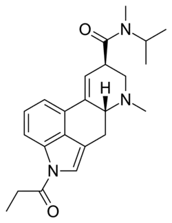 1P-MiPLA, also known as 1-propanoyl-lysergic acid methylisopropylamide (1-propanoyl-MiPLA), is a designer drug and presumed serotonergic psychedelic of the lysergamide family related to lysergic acid diethylamide (LSD).[1][2][3] It is the 1-propanoyl derivative of MiPLA and may act as a prodrug of MiPLA.[1][2][3] 1P-MiPLA has been discussed on specialized online forums since 2018.[1] In addition, a designer drug product labeled "1P-MiPLA" but actually containing MiPLA was encountered in Austria in 2019.[1]