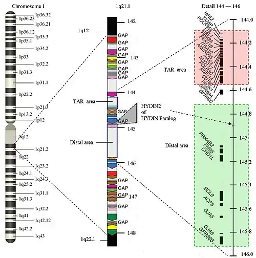 The structure of 1q21.1 is complex. The area has a size of approximately 6 Megabase (Mb) (from 141.5 Mb to 147.9 Mb). Within 1q21.1 there are two areas where the CNVs can be found: the proximal area or TAR area (144.1 to 144.5) and the distal area (144.7 to 145.9). A 1q21.1 CNV will commonly be found in one of these areas, but an overlap with the other area or parts that are outside these areas are possible. 1q21.1 has multiple repetitions of the same structure: Only 25% of the structure is not duplicated. There are several gaps in the sequence. There is no further information available about the DNA-sequence in those areas up till now. The gaps represent approximately 700 Kilobase. New genes are expected in the gaps. The area of 1q21.1 is one of the most difficult parts of the human genome to map.
