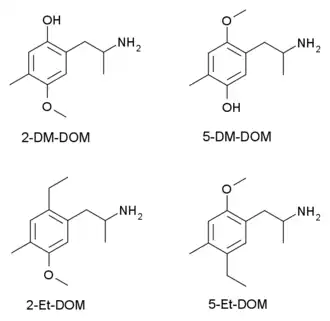 The 2,6-dimethoxy positional isomer of DOM, known as Ψ-DOM, is also mentioned in PiHKAL as being active, as is the α-ethyl homologue Ariadne. Analogues where the methoxy groups at the 2,5- positions of the aromatic ring have been altered have also been synthesised and tested as part of an effort to identify the binding mode of DOM at the serotonin 5-HT2A receptor. Both the 2- and 5- O-desmethyl derivatives 2-DM-DOM and 5-DM-DOM, and the 2- and 5- ethyl analogues 2-Et-DOM and 5-Et-DOM, have been tested, but in all cases were significantly less potent than the corresponding methoxy compound, showing the importance of the oxygen lone pairs in 5-HT2A binding.[40][43]