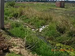 An open drain in Kuwadzana township, Harare in 2004. By 2008 drains such as this were carrying sewage from burst sewage pipes and feces washed out of the neighbouring areas as the urban sanitation system collapsed. This contributed to the rapid spread of the cholera outbreak.