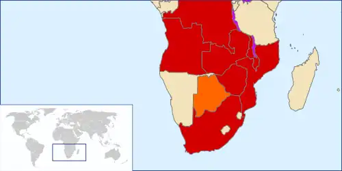 Spread of cholera within southern Africa, as of 10 February 2009. Not all cases are part of the 2008–2009 Zimbabwean cholera outbreak.