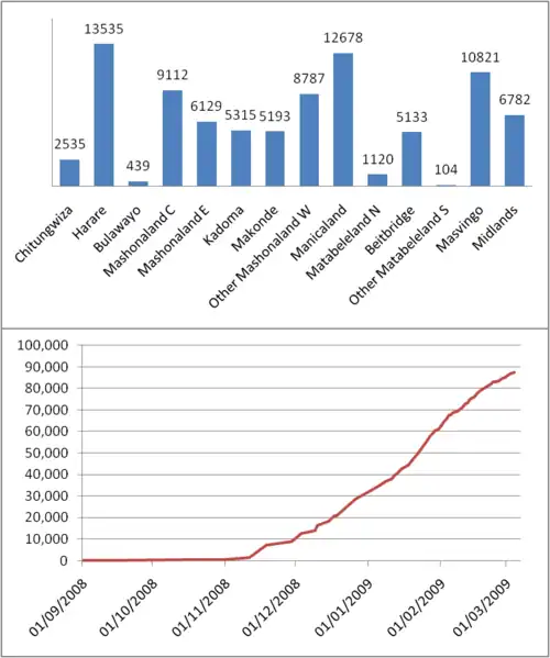The spread of cholera in Zimbabwe: (top) The number of cases recorded in the most infected centres and districts, and in the remainder of each province of Zimbabwe as of 4 March 2009. (bottom) Total number of reported cases. Since totals for many districts are not updated daily, the first occurrence of a case may represent the date of the reporting of that case, not the date of infection. Data sources: United Nations Office for the Coordination of Humanitarian Affairs,[1] the World Health Organization,[5] the International Federation of Red Cross and Red Crescent Societies.[2][26] and news media,[11][27][28][29][30][31]