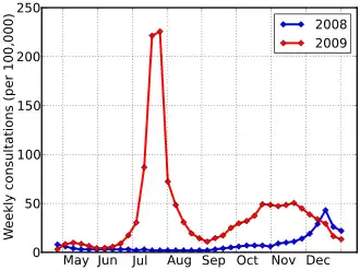 - ↑ "Weekly epidemiological update". Health Protection Agency. 22 October 2009. Archived from the original on 20 November 2009. Retrieved 25 October 2009.