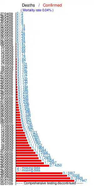 | 9 July | The government announced that there are now over 9,000 cases of Swine flu in the UK and 14 patients have died,[36] 2 in Scotland, 5 in London, and the remainder elsewhere in England.[37] |