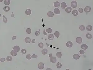 Schistocytes seen in a person with hemolytic-uremic syndrome | |