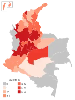 On July 8, the National Institute of Health confirmed a new case of the disease in Bogota from a person who had been in contact with an infected person from Italy when they had traveled to Europe.[24] On July 23, following the follow-up of several cases, health authorities began an extensive surveillance phase.[25] On the same day, the National Institute of Health confirmed that the number of cases in the country reached 10.[26] On July 25, the first case of a person who had been in Argentina was reported in the department of Cundinamarca, specifically in the municipality of Cajicá.[27] On July 29, the first case was detected in Pereira, capital of the department of Risaralda.[28] On July 30, the National Institute of Health confirmed the first case in the department of Valle del Cauca, specifically in the city of Cartago located in the north of the department.[29]