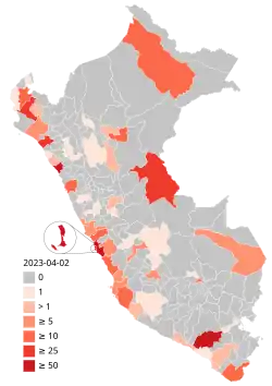 The 2022–2023 mpox outbreak in Peru is a part of the outbreak of human mpox caused by the West African clade of the monkeypox virus. The outbreak reached Peru on 26 June 2022.[1]
