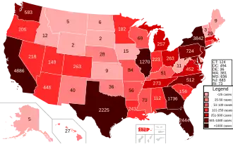 The 2022–2023 mpox outbreak in the United States was part of the larger outbreak of human mpox caused by the West African clade of the monkeypox virus. The United States was the fourth country outside of the African countries with endemic mpox to experience an outbreak in 2022. The first case was documented in Boston, Massachusetts, on May 17, 2022.[3] As of August 2022, mpox had spread to all 50 states in the United States, as well as Washington, D.C., and Puerto Rico.[4] The United States had the highest number of mpox cases in the world during the outbreak.[5] California had the highest number of mpox cases in the United States.