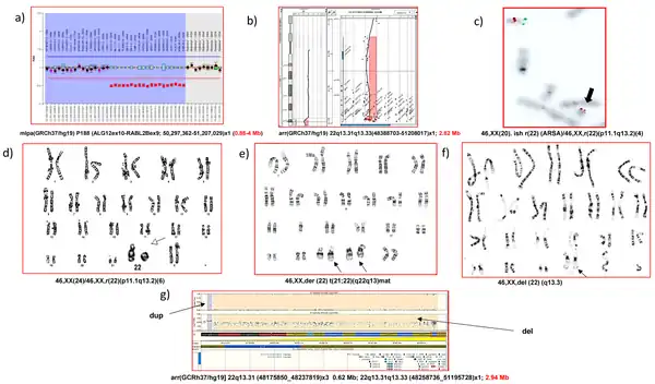 - ↑ Koolen, David A.; Reardon, William; Rosser, Elisabeth M.; Lacombe, Didier; Hurst, Jane A.; Law, Caroline J.; Bongers, Ernie M. H. F.; van Ravenswaaij-Arts, Conny M.; Leisink, Martijn A. R. (2005-09-01). "Molecular characterisation of patients with subtelomeric 22q abnormalities using chromosome specific array-based comparative genomic hybridisation". European Journal of Human Genetics. 13 (9): 1019–1024. doi:10.1038/sj.ejhg.5201456. ISSN 1018-4813. PMID 15986041.
