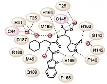 - ↑ 1.0 1.1 1.2 Dai W, Zhang B, Jiang XM, Su H, Li J, Zhao Y, et al. (June 2020). "Structure-based design of antiviral drug candidates targeting the SARS-CoV-2 main protease". Science. 368 (6497): 1331–1335. Bibcode:2020Sci...368.1331D. doi:10.1126/science.abb4489. PMC 7179937. PMID 32321856.
