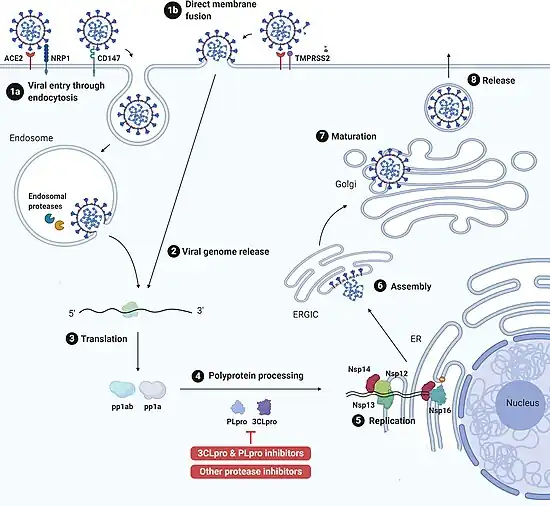 - ↑ Ullrich S, Nitsche C (July 2020). "The SARS-CoV-2 main protease as a drug target". Bioorganic & Medicinal Chemistry Letters. 30 (17): 127377. doi:10.1016/j.bmcl.2020.127377. PMC 7331567. PMID 32738988. S2CID 220304661.