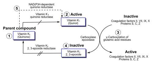 The primary mechanism of the 4-hydroxycoumarin drugs is the inhibition of vitamin K epoxide reductase. These compounds are not direct antagonists (in the pharmaceutical sense) of vitamin K, but rather act to deplete reduced vitamin K in tissues. For this reason vitamin K antagonizes their effect, and this has led to the loose terminology of "vitamin K antagonist".