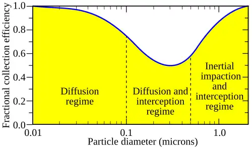 Since filters are tested against the by definition most penetrating particle size of 0.3 μm, an APR with a P100 classification would be at least 99.97% efficient at removing particles of this size.[N2] Particles with a size both less than and greater than 0.3 μm may be filtered at an efficiency greater than 99.97%.[N2] However, this may not always be the case, as the most penetrating particle size for N95s was measured to be below 0.1 μm, as opposed to the predicted size of between 0.1 and 0.3 μm.[22]