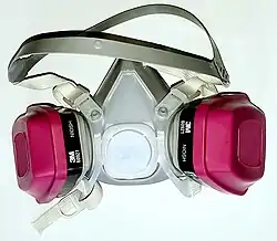 Half-face air-purifying respirator with combination P100 particulate filter (magenta) and organic vapor (black) cartridge