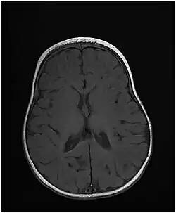 | Axial T1-weighted MRI of the brain at 10 months old showing under-myelination of the internal capsules, relative under-myelination of the remainder of the subcortical white matter, and a thin corpus callosum. From an MTHFS deficiency case report by Romero et al., 2019.[1] | |