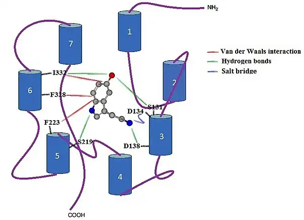 Serotonin is an endogenous non-selective agonist for the 5-HT2C receptor with a binding constant of Ki = 16.0 nM. When serotonin binds to the receptors, the most important contacts are in TM helixes 3, 5 and 6 (Figure 3), while the other four TM helixes do not interact directly with the serotonin compound. When binding of serotonin takes place, the protonated primary amine site forms a salt bridge with D134 residue in TM 3, as well as forming a hydrogen bond with residue S138 in TM 3. The aromatic indole ring forms a strong Van der Waals interaction with residues F223 in TM 5 and F328 in TM 6. The ring falls tight into the receptor pocket, stacked between two phenylalanines. Amine of the indole group forms a hydrogen bond with S219 residue in TM 5 and hydroxide substituent of the indole forms hydrogen bonds both with residue S131 in TM 3 and I332 in TM 6. There is also a strong Van der Waals interaction between the indole and I332 in TM 6.[31]