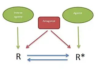 5-HT2 receptors are G protein-coupled receptors that can regulate cellular signaling in the absence of a ligand. This can be explained by a two-state model (Figure 2) where the receptor is in equilibrium between two states, an active state (R*) and an inactive state (R). Basal effector activity is defined, in part, by the absolute level of (R*), which will increase along with increasing receptor density. Ligands that preferentially bind to and stabilize the R state are termed inverse agonists and reduce the effector activity. Agonists preferentially bind to and stabilize the R* state, thereby increasing effector activity. Neutral antagonists show equal affinity for both conformations and do not alter the equilibrium between the two states, however they occupy the receptor and can block the effect of both agonists and inverse agonists.[28][29]