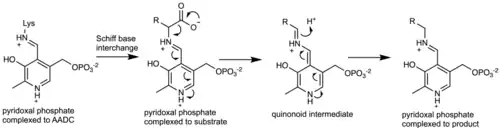 The enzyme uses pyridoxal phosphate (PLP), the active form of vitamin B6, as a cofactor. PLP is essential to the mechanism of decarboxylation in AADC. In the active enzyme, PLP is bound to lysine-303 of AADC as a Schiff base. Upon substrate binding, Lys-303 is displaced by the substrate's amine. This positions the carboxylate of the substrate within the active site such that decarboxylation is favored. Decarboxylation of the substrate produces a quinonoid intermediate, which is subsequently protonated to produce a Schiff base adduct of PLP and the decarboxylated product. Lys-303 can then regenerate the original Schiff base, releasing the product while retaining PLP.[2]