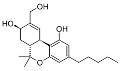8,11-Dihydroxytetrahydrocannabinol (8β,11-diOH-Δ9-THC) is an active metabolite of THC, the main active component of cannabis. The 8β enantiomer retains psychoactive effects in animal studies with only slightly lower potency than THC, while the 8α enantiomer is much weaker. Both enantiomers have a shorter half-life in the body than 11-hydroxy-THC, making 8,11-dihydroxy-THC potentially useful for drug testing to distinguish between recent cannabis use and use longer in the past.[1][2][3]