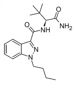 - ↑ Sparkes E, Cairns EA, Kevin RC, Lai F, Grafinger KE, Chen S, et al. (February 2022). "Structure-activity relationships of valine, tert-leucine, and phenylalanine amino acid-derived synthetic cannabinoid receptor agonists related to ADB-BUTINACA, APP-BUTINACA, and ADB-P7AICA". RSC Medicinal Chemistry. 13 (2): 156–174. doi:10.1039/D1MD00242B. PMC 8864554. PMID 35308023. S2CID 239951357.
