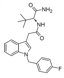 ADB-FUBIATA (AD-18, FUB-ACADB, ADB-FUBIACA) is a synthetic cannabinoid compound first identified in 2021. It is closely related in structure to the older compound ADB-FUBICA but with the amide linker group extended by the addition of a methylene bridge. It started to be sold as an ingredient in grey-market synthetic cannabis blends following the introduction of legislation in China which for the first time introduced general controls on various classes of synthetic cannabinoids,[2] but did not encompass compounds where the linker group had been extended in this fashion. ADB-FUBIATA has many times lower affinity for cannabinoid receptors than ADB-FUBICA with an EC50 of only 635 nM at CB1, but retains full agonist activity at this target, while being practically inactive at CB2.[3][4]
