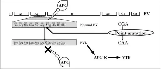 APC (with protein S as a cofactor) degrades Factor Va and Factor VIIIa. APC resistance is the inability of protein C to cleave Factor Va and/or Factor VIIIa, which allows for longer duration of thrombin generation and may lead to a hypercoagulable state. This may be hereditary or acquired.[5] The best known and most common hereditary form is Factor V Leiden, which is responsible for more than 95% of cases.[6] Other genetic causes include Factor V Cambridge (VThr306) and the factor V HR2 haplotype (A4070G mutation).[6][7] Acquired forms of APC resistance occur in the presence of elevated Factor VIII concentrations. Antiphospholipid antibodies,[6] pregnancy, and certain forms of estrogen therapy, such as ethinylestradiol-containing birth control pills, have been found to produce acquired APC resistance.[8][9][10][11][12][13][14][15]