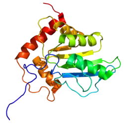 APOBEC3G (apolipoprotein B mRNA editing enzyme, catalytic subunit 3G) is a human enzyme encoded by the APOBEC3G gene that belongs to the APOBEC superfamily of proteins.[4] This family of proteins has been suggested to play an important role in innate anti-viral immunity.[5] APOBEC3G belongs to the family of cytidine deaminases that catalyze the deamination of cytidine to uridine in the single stranded DNA substrate.[4] The C-terminal domain of A3G renders catalytic activity, several NMR and crystal structures explain the substrate specificity and catalytic activity.[6][7][8][9][10][11][12][13]