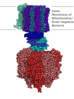Molecular model of ATP synthase determined by X-ray crystallography. Stator is not shown here. | |||||||||
