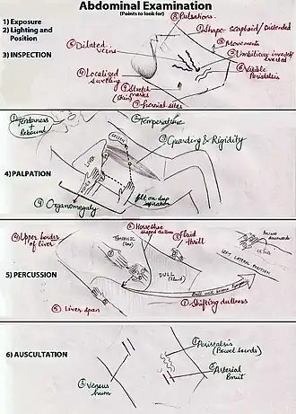 An abdominal examination is a portion of the physical examination which a physician or nurse uses to clinically observe the abdomen of a patient for signs of disease. The abdominal examination is conventionally split into four different stages: first, inspection of the patient and the visible characteristics of their abdomen. Auscultation (listening) of the abdomen with a stethoscope. Palpation of the patient's abdomen. Finally, percussion (tapping) of the patient's abdomen and abdominal organs.[1] Depending on the need to test for specific diseases such as ascites, special tests may be performed as a part of the physical examination.[2] An abdominal examination may be performed because the physician suspects a disease of the organs inside the abdominal cavity (including the liver, spleen, large or small intestines), or simply as a part of a complete physical examination for other conditions. In a complete physical examination, the abdominal exam classically follows the respiratory examination and cardiovascular examination.[3]
