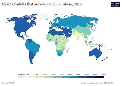 The prevalence of abdominal obesity is increasing in Western populations, possibly due to a combination of low physical activity and high-calorie diets, and also in developing countries, where it is associated with the urbanization of populations.[76][77]