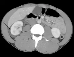 | Abdominal trauma resulting in a right kidney contusion (open arrow) and blood surrounding the kidney (closed arrow) as seen on CT | |