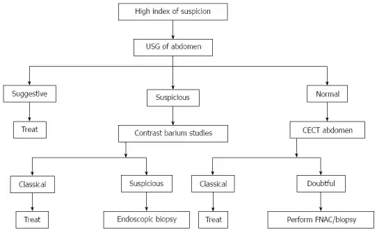 The clinical presentation of abdominal tuberculosis is often atypical, tissue samples for confirmation of diagnosis can be difficult to procure and conventional diagnostic methods have poor yield.[5] Therefore, the diagnosis is often delayed.[5] The diagnosis is often suspected clinically with relevant manifestations or epidemiological factors such as known prior tuberculosis and possible TB exposure.[13] A high index of suspicion of TB should be maintained in immunocompromised individuals.[13] Those with extra-abdominal tuberculosis should undergo evaluation for abdominal involvement in case of clinical suspicion. The definitive diagnosis can be established by demonstrating Mycobacterium tuberculosis in peritoneal fluid or in a biopsy specimen. The histopathologic findings of tuberculosis in biopsy, such as caseous granuloma, can be suggestive of tuberculosis, but is not pathognomic.[13] CT scan offers evaluation of involvement of the liver or other organs, as well as for the presence of ascites, lymphadenopathy and peritoneal involvement.[13] Ultrasound scan is useful for demonstrating lymphadenopathy and ascites.[14]