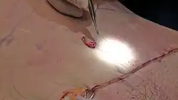 - The flap is stitched back into place.