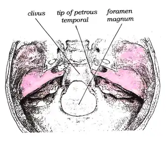 The nerve enters the subarachnoid space (more precisely, the pontine cistern[2]) when it emerges from the brainstem. It runs upward between the pons and the clivus, and then pierces the dura mater to run between the dura and the skull through Dorello's canal.[3][4] At the apex of the petrous part of the temporal bone, it makes a sharp turn forward to enter the cavernous sinus.[1] In the cavernous sinus, it runs anterior-ward alongside (inferolateral to) the internal carotid artery. It enters the orbit through (medial end of) the superior orbital fissure, passing through the common tendinous ring to reach and innervate the lateral rectus muscle of the eye.[2]