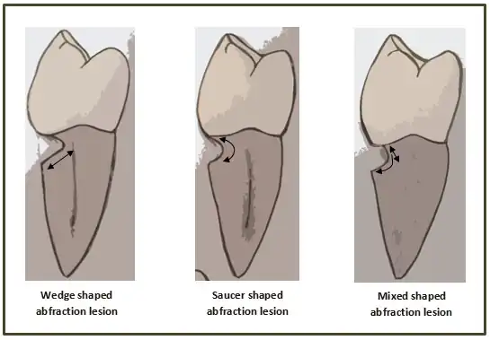 When looking at abfraction lesions there are generally three shapes in which they appear, appearing as either wedge, saucer or mixed patterns.[7] Wedge and saucer shaped lesions are the most common, whereas mixed lesions are less frequently identified in the oral cavity.[7] In reference to figure 1, wedge shaped lesions have the sharpest internal line angles and saucer/mixed shaped lesions are either smooth internally, or a variety.