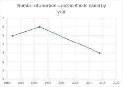 Between 1982 and 1992, the number of abortion clinics in the state increased from five in 1982 to six in 1992.[18] In 2014, there were three abortion clinics in the state.[19] In 2014, 80% of the counties in the state did not have an abortion clinic. That year, 36% of women in the state aged 15–44 lived in a county without an abortion clinic.[20] In 2017, there was one Planned Parenthood clinic, which offered abortion services, in a state with a population of 246,389 women aged 15–49.[21]
