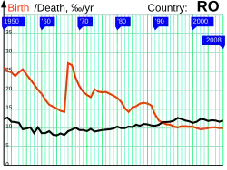 The effect of this policy was a sudden transition from a birth rate of 14.3 per 1,000 in 1966 to 27.4 per 1,000 in 1967, though it fell back to 14.3 in 1983.[7]