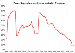 Abortion in Romania is currently legal as an elective procedure during the first 14 weeks of pregnancy, and for medical reasons at later stages of pregnancy.[1] In the year 2024, there were 148,916 live births and 29,391 reported abortions,[2] meaning that 16.5% of the 178,307 reported pregnancies that year ended in abortion.