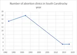 Between 1982 and 1992, the number of abortion clinics in the state increased by three, going from fifteen in 1982 to eighteen in 1992.[46] In 2014, there were three abortion clinics in the state.[47] In 2014, 93% of the counties in the state did not have an abortion clinic. That year, 71% of women in the state aged 15–44 lived in a county without an abortion clinic.[48] In 2017, there were two Planned Parenthood clinics, one of which offered abortion services, in a state with a population of 1,112,199 women aged 15–49.[49] In 2018, there were three licensed abortion clinics in the state. They were in Charleston, Columbia and Greenville.[12] The Charleston clinic was a Planned Parenthood clinic in West Ashley.[12]