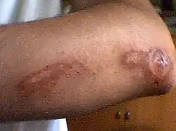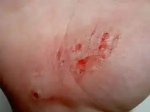 An abrasion is a partial thickness wound caused by damage to the skin.[1] It can be superficial involving only the epidermis to deep, involving the deep dermis. Abrasions usually involve minimal bleeding.[2] Mild abrasions, also known as grazes or scrapes, do not scar or bleed because the dermis is left intact, but deep abrasions that disrupt the normal dermal structures may lead to the formation of scar tissue. A more traumatic abrasion that removes all layers of skin is called an avulsion.