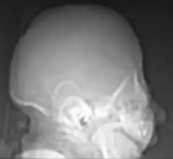 Acalvaria is a rare malformation consisting of absence of the calvarial bones, dura mater and associated muscles in the presence of a normal skull base and normal facial bones. The central nervous system is usually unaffected. The presumed pathogenesis of acalvaria is faulty migration of the membranous neurocranium with normal placement of the embryonic ectoderm, resulting in absence of the calvaria but an intact layer of skin over the brain parenchyma. In other words, instead of having a skull cap protecting the brain, there is only skin covering it.[1] The size of the area that is missing the skull cap can vary from case to case. In extreme cases, the entire top part of the cranium that is dome-shaped may be absent.[2]