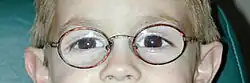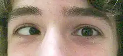 Esotropia (aka ET)[1] (from Greek eso 'inward' and trope 'a turning'[2]) is a form of strabismus in which one or both eyes turn inward. The condition can be constantly present, or occur intermittently, and can give the affected individual a "cross-eyed" appearance.[3] It is the opposite of exotropia and usually involves more severe axis deviation than esophoria. Esotropia is sometimes erroneously called "lazy eye", which describes the condition of amblyopia; a reduction in vision of one or both eyes that is not the result of any pathology of the eye and cannot be resolved by the use of corrective lenses. Amblyopia can, however, arise as a result of esotropia occurring in childhood: In order to relieve symptoms of diplopia or double vision, the child's brain will ignore or "suppress" the image from the esotropic eye, which when allowed to continue untreated will lead to the development of amblyopia. Treatment options for esotropia include glasses to correct refractive errors (see accommodative esotropia below), the use of prisms, orthoptic exercises, or eye muscle surgery.