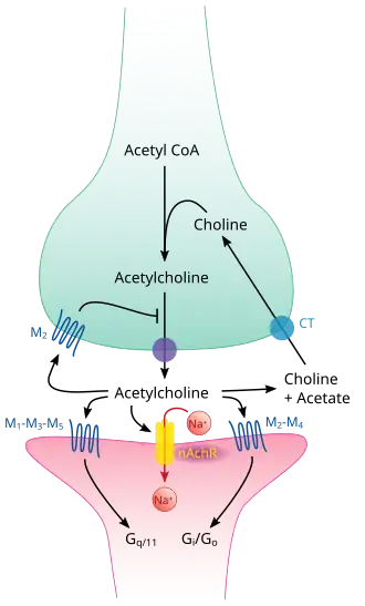 - ↑ 2.0 2.1 2.2 Sam C, Bordoni B (2023). "Physiology, Acetylcholine". StatPearls. Treasure Island (FL): StatPearls Publishing. PMID 32491757. Archived from the original on 2023-04-06. Retrieved 2023-04-06.